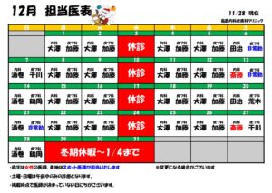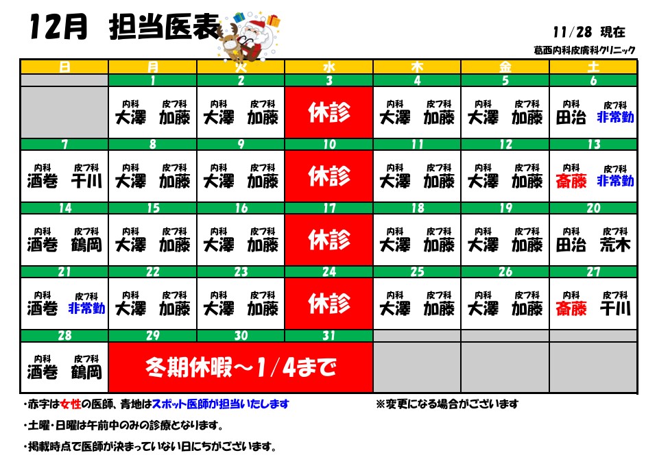 赤字の医師は女性医師、青字の医師はスポット医師が診療を担当いたします。